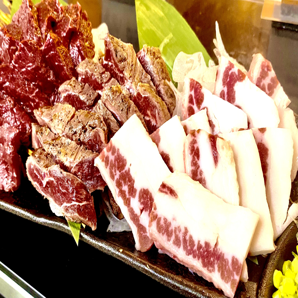 フタエゴはお腹の下辺り、あばら部分の近くにある馬肉の部位です。 馬1頭から少ししか取れない大変希少な部位。 フタエゴは見た目に特徴があり、脂身がお肉を挟んでおり三層構造になっていますので、お皿に盛り付けた際に紅白が交互に並びおめでたい感じですごくキレイです。 1パック約100g/真空パック冷凍しています。
